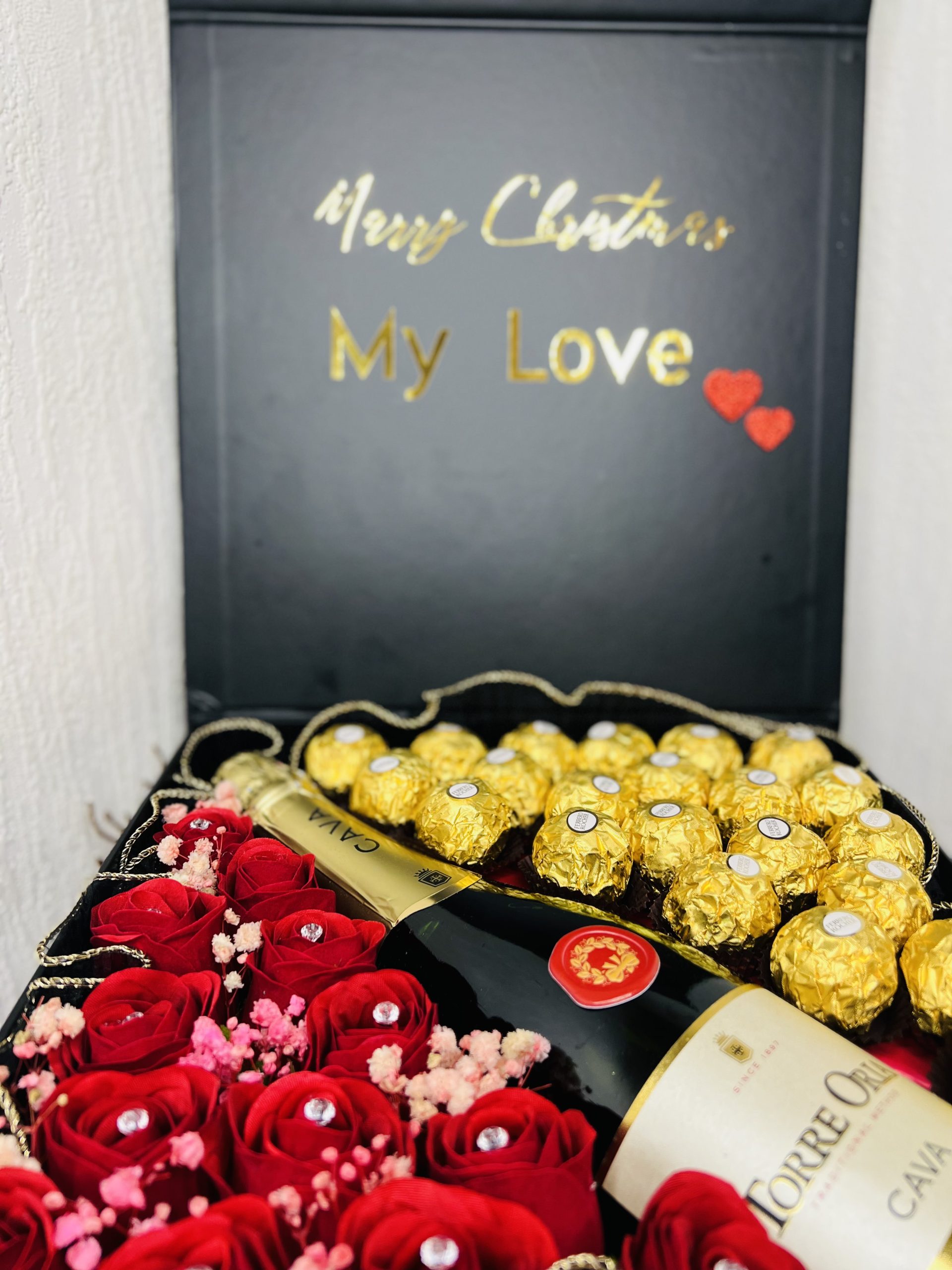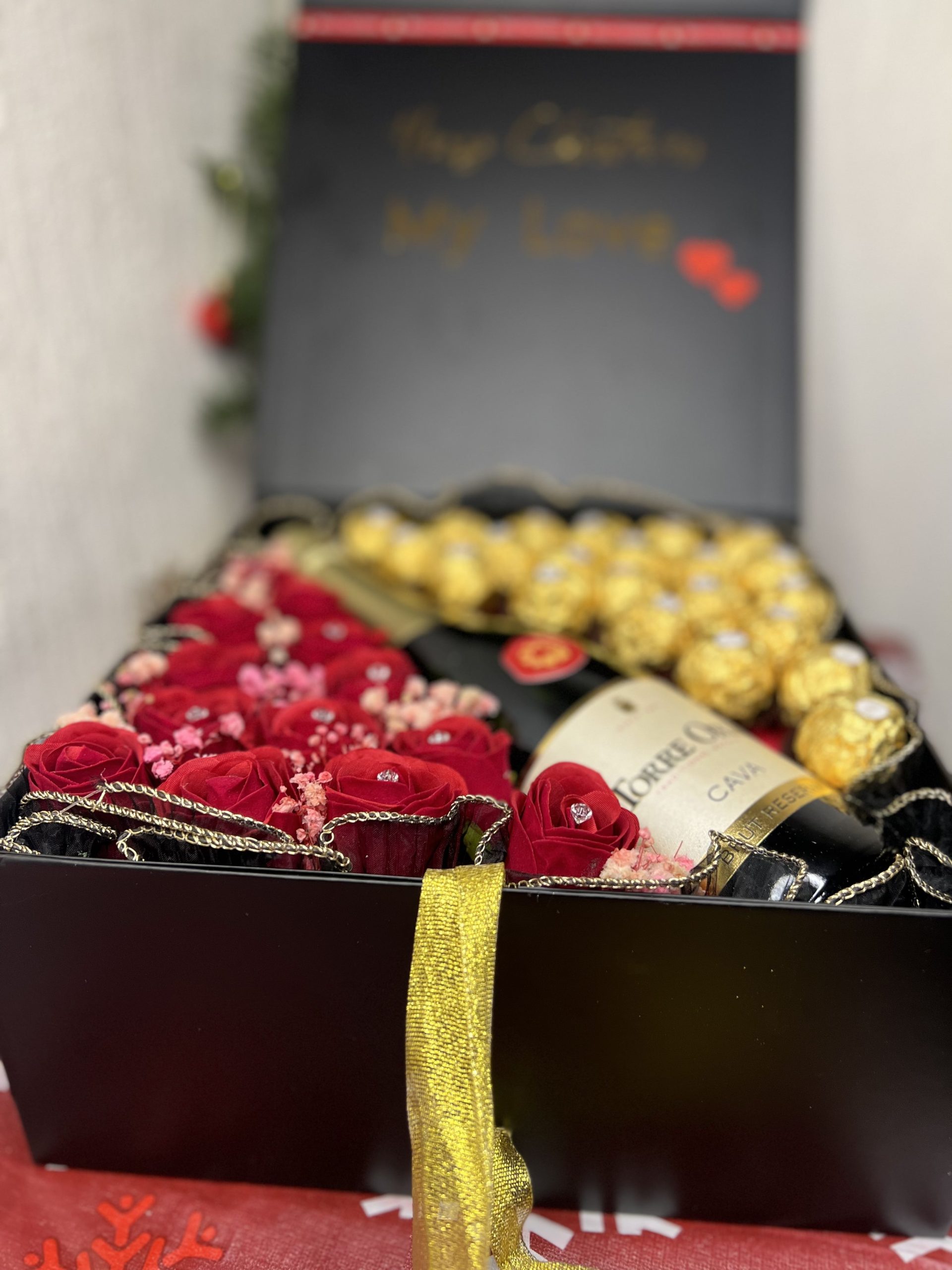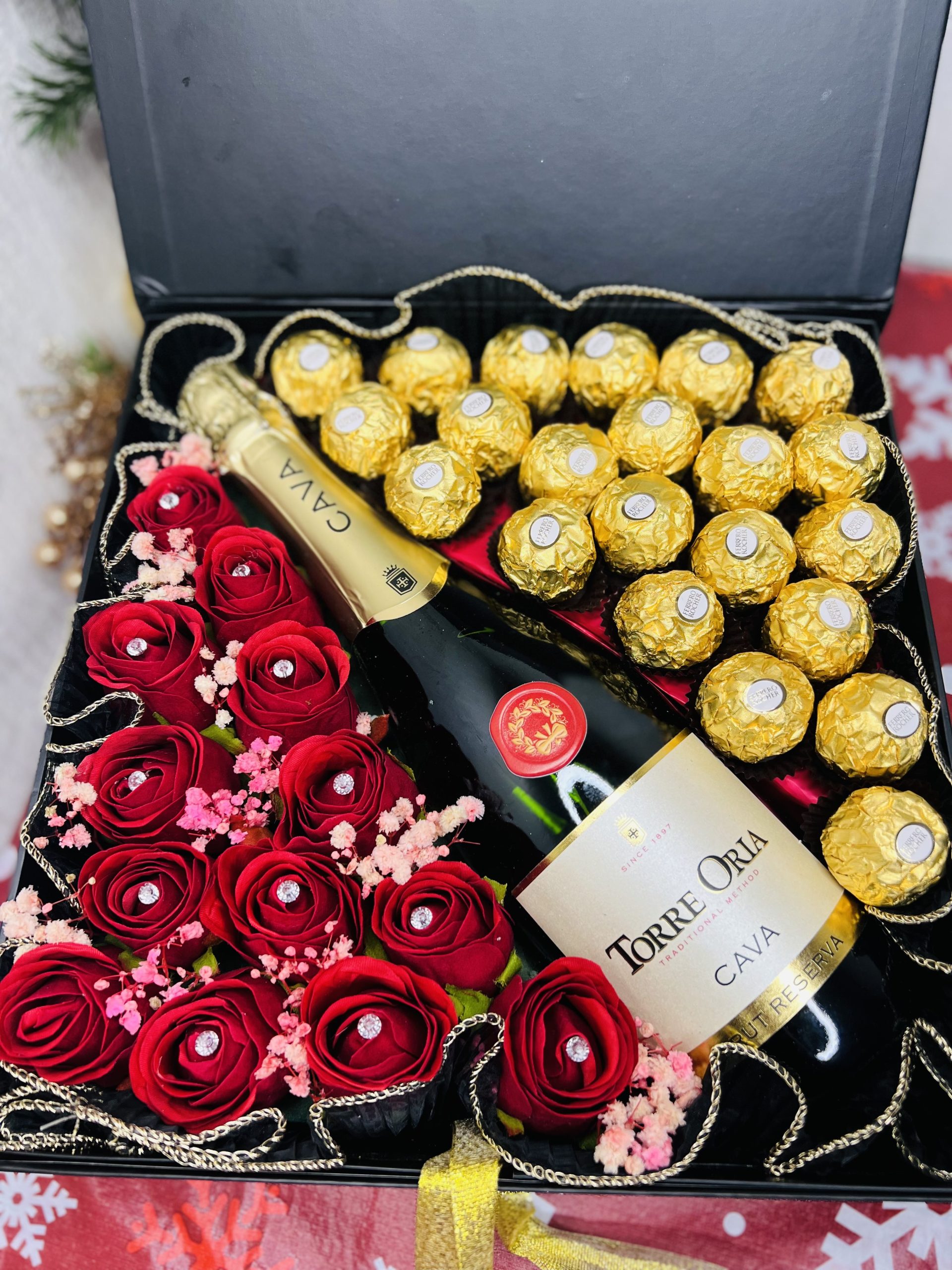 The interior is meticulously arranged to reveal a stunning composition: deep red roses, sparkling floral accents, golden premium chocolates, and a bottle of Cava resting elegantly at the center. Each section is carefully balanced to create the perfect blend of colors, textures, and emotions. The rosesâsymbols of love, passion, and admirationâinstantly draw the eye with their rich red tones and delicate crystal-like embellishments. They bring a romantic touch that speaks directly to the heart, transforming the arrangement into a timeless expression of affection.